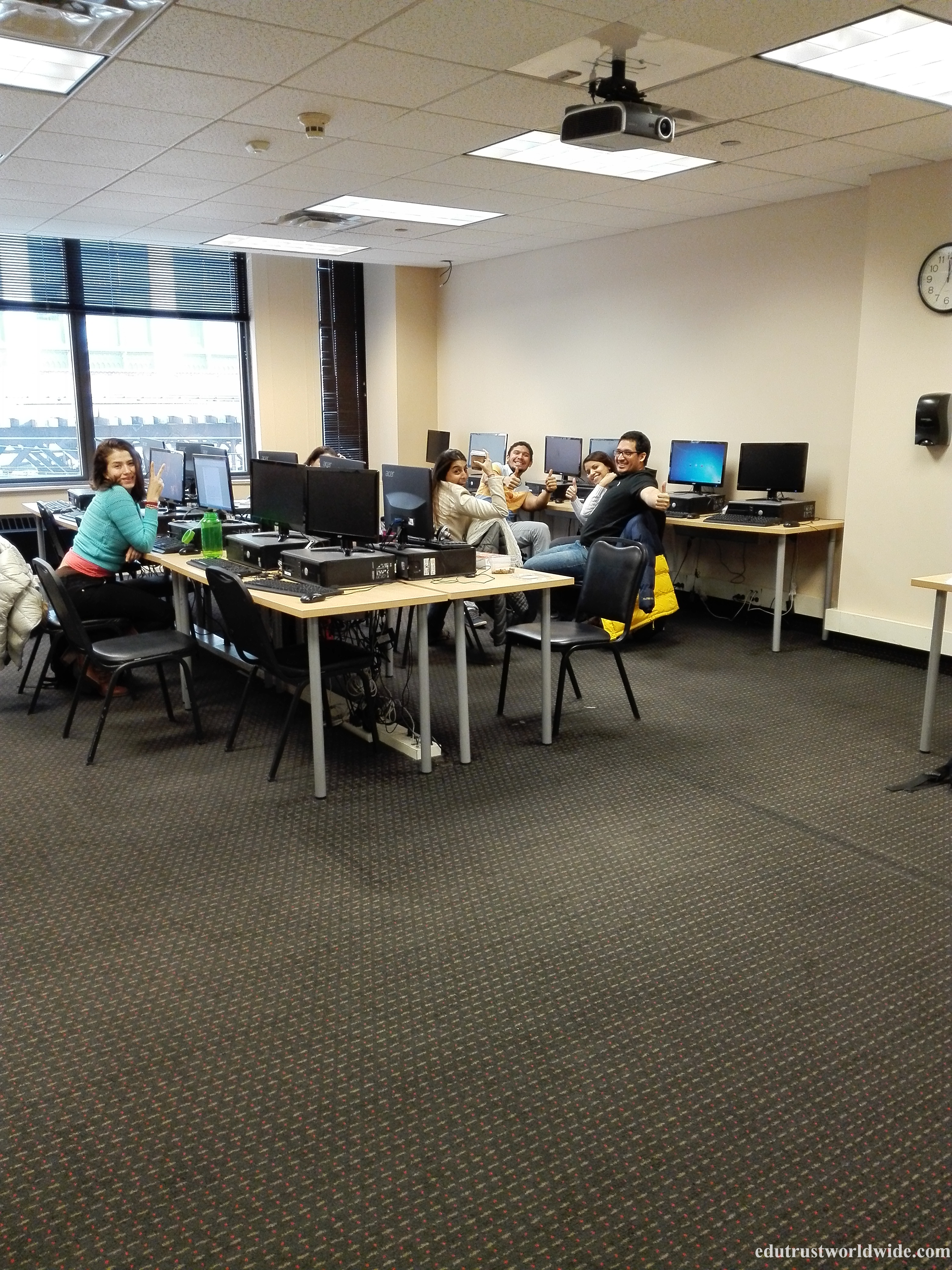 ห้องคอมพิวเตอร์ ห้องเรียน ห้องอาหาร บอร์ดแสดงกิจกรรมของนักเรียน และนักเรียนไทยที่กำลังเรียนที่นี่