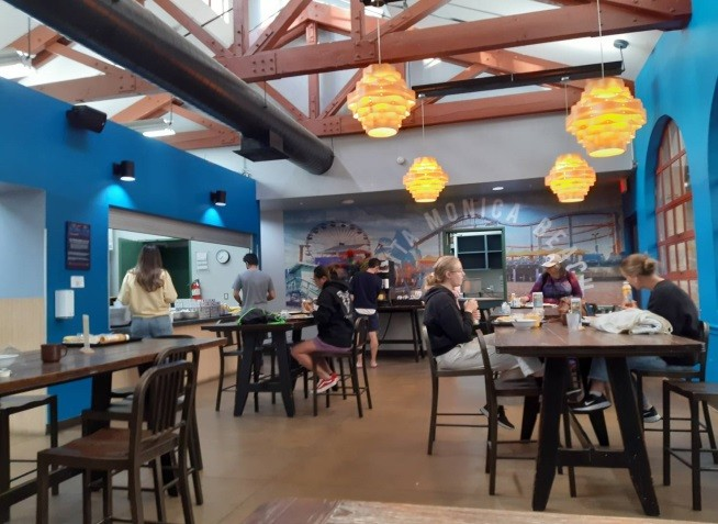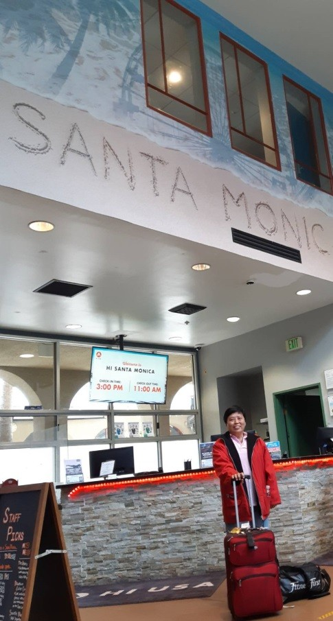 พอได้ขึ้นบนรถ ฉันถามว่าค่ารถเท่าไหร่ คนขับบอกว่า 50 cents !!! ฉันดีใจมากขึ้นไปอีก และชอบใจมากที่ประหยัดค่าเดินทางไปได้เยอะมาก รถ Shuttle Bus พาฉันมาถึงถนน Broadway และคนขับบอกว่า คุณลงตรงนี้นะ แล้วเดินไปถนน 2nd street ซึ่งตอนนั้นเป็นเวลาประมาณ 6:00 กว่าแล้ว เลยดูไม่น่ากลัวมาก แต่ก็มองเห็นได้ว่ามีพวก homeless และพวกกินเหล้า เดินโซซัดโซเซ พอสมควร และในที่สุด ดิฉันก็เดินมาถึงที่พัก HI Santa Monica ได้สำเร็จ!!! ในเวลาประมาณ 7:00 เช้า ซึ่งทางเจ้าหน้าที่ยังไม่ให้ check-in เพราะยังเช้ามาก แต่ใจดีที่ให้กินข้าวเช้าของที่พักได้