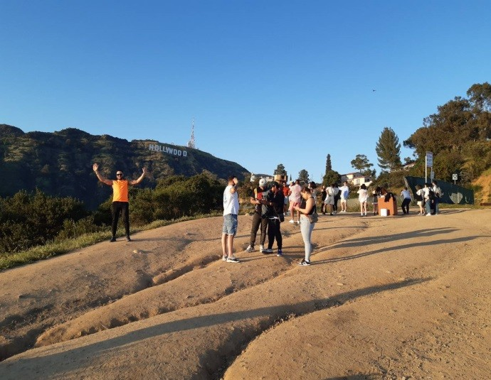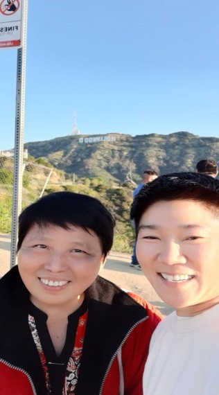 ละท้ายที่สุดที่ประทับใจมากและถือเป็นความโชคดีของฉันคือ บังเอิญได้รู้จักกับน้องผิง โดยที่มีลูกค้าเก่าที่ฉันเคยช่วยทำการเปลี่ยนสถานะวีซ่าให้แนะนำมาว่าให้ติดต่อฉันเพื่อจะขอคุยเรื่องการให้ช่วยทำการเปลี่ยนสถานะวีซ่าจาก J1 เป็น F1 ของเด็กที่เขารู้จัก และพอดีน้องผิงอยู่ที่ LA เลยทำให้สะดวกมากในการพบปะพูดคุย ฉันเลยขอถือโอกาสเจอกับน้องผิง และฉันก็เล่าให้ฟังว่าอยากไปเที่ยวชมป้าย Hollywood แบบใกล้ๆ น้องผิงเลยจัดการช่วยพาไปให้หลังน้องเลิกงาน และนี่คือภาพแห่งความทรงจำที่ดีมากของฉันในการเดินทางไป LA ครั้งนี้